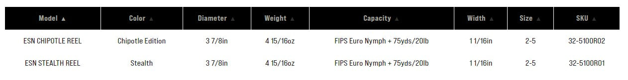 {"id":6595750887523,"title":"Sage ESN Fly Reel","handle":"sage-esn-stealth-reel","description":"\u003cp\u003ePacked with a suite of specialty features, the ESN reel is designed specifically with the Euro-Nymph angler in mind and is fine tuned to the nuances of the application. Built around a super thin and large diameter arbor, this design now makes it easier to get fish on the reel quickly, minimizing the need to guideline onto the spool with your finger, all while providing consistent drag output. A unique balance system allows anglers to assemble and fine-tune a set of weights, so the ESN reel can perfectly balance any Euro Nymphing (or standard) rod. Add in a full frame that prevents fine leaders and lines from sneaking through the frame, and a sealed carbon drag system that provides a smooth uptake - leaving you with the ultimate fish-catching machine.\u003c\/p\u003e\n\u003cp\u003eProduct Details\u003c\/p\u003e\n\u003cul\u003e\n\u003cli\u003eFull Frame\u003c\/li\u003e\n\u003cli\u003eSCS Drag\u003c\/li\u003e\n\u003cli\u003eOne Revolution Drag Knob with 20 numbers and 40 detented settings\u003c\/li\u003e\n\u003cli\u003eUltra-large arbor for fast line pick-up\u003c\/li\u003e\n\u003cli\u003eNarrower spool for small-volume ESN lines\u003c\/li\u003e\n\u003cli\u003eConcave, ported arbor for greater strength and capacity\u003c\/li\u003e\n\u003cli\u003eFully machined 6061-T6 aerospace grade aluminum\u003c\/li\u003e\n\u003cli\u003eCold forged and tempered for superior strength and rigidity\u003c\/li\u003e\n\u003cli\u003eHard anodized for surface protection and corrosion resistance\u003c\/li\u003e\n\u003cli\u003eStainless steel 1\/2, 1, and 1-1\/2 oz weights to adjust ideal balance point of nymphing setup\u003c\/li\u003e\n\u003cli\u003eErgonomic handle\u003c\/li\u003e\n\u003cli\u003eEasy conversion from left- to right-hand retrieve\u003c\/li\u003e\n\u003cli\u003eNeoprene and embroidered ballistic nylon reel case \u0026amp; spare weight case\u003c\/li\u003e\n\u003cli\u003eColors: Stealth, Chipotle\u003c\/li\u003e\n\u003c\/ul\u003e","published_at":"2025-02-11T10:48:57-07:00","created_at":"2021-06-22T12:15:13-06:00","vendor":"Sage","type":"Fly Reels","tags":["Fly Reels","Sage","Sage ESN","Sage ESN Fly Reel","Sage Fly Reel","Type_Euro Nymph","Type_Sage"],"price":50000,"price_min":50000,"price_max":50000,"available":true,"price_varies":false,"compare_at_price":null,"compare_at_price_min":0,"compare_at_price_max":0,"compare_at_price_varies":false,"variants":[{"id":43945165422691,"title":"Black","option1":"Black","option2":null,"option3":null,"sku":"32-5100R01","requires_shipping":true,"taxable":true,"featured_image":{"id":35092946059363,"product_id":6595750887523,"position":1,"created_at":"2026-01-11T12:35:24-07:00","updated_at":"2026-01-11T12:37:25-07:00","alt":null,"width":587,"height":480,"src":"\/\/eastrosebudflyandtackle.com\/cdn\/shop\/files\/SpectrumBlack_a8a4df2a-85d0-4a77-91f5-68ea6dcc1339.jpg?v=1768160245","variant_ids":[43945165422691]},"available":true,"name":"Sage ESN Fly Reel - Black","public_title":"Black","options":["Black"],"price":50000,"weight":0,"compare_at_price":null,"inventory_quantity":2,"inventory_management":"shopify","inventory_policy":"deny","barcode":"644269248942","featured_media":{"alt":null,"id":26649632047203,"position":1,"preview_image":{"aspect_ratio":1.223,"height":480,"width":587,"src":"\/\/eastrosebudflyandtackle.com\/cdn\/shop\/files\/SpectrumBlack_a8a4df2a-85d0-4a77-91f5-68ea6dcc1339.jpg?v=1768160245"}},"requires_selling_plan":false,"selling_plan_allocations":[]}],"images":["\/\/eastrosebudflyandtackle.com\/cdn\/shop\/files\/SpectrumBlack_a8a4df2a-85d0-4a77-91f5-68ea6dcc1339.jpg?v=1768160245","\/\/eastrosebudflyandtackle.com\/cdn\/shop\/products\/1afa6e6c-0edf-4b2c-8c59-3d41449cb012.jpg?v=1768160245","\/\/eastrosebudflyandtackle.com\/cdn\/shop\/files\/Stealth2.jpg?v=1768160126","\/\/eastrosebudflyandtackle.com\/cdn\/shop\/files\/StealthModels.jpg?v=1768160128"],"featured_image":"\/\/eastrosebudflyandtackle.com\/cdn\/shop\/files\/SpectrumBlack_a8a4df2a-85d0-4a77-91f5-68ea6dcc1339.jpg?v=1768160245","options":["Color"],"media":[{"alt":null,"id":26649632047203,"position":1,"preview_image":{"aspect_ratio":1.223,"height":480,"width":587,"src":"\/\/eastrosebudflyandtackle.com\/cdn\/shop\/files\/SpectrumBlack_a8a4df2a-85d0-4a77-91f5-68ea6dcc1339.jpg?v=1768160245"},"aspect_ratio":1.223,"height":480,"media_type":"image","src":"\/\/eastrosebudflyandtackle.com\/cdn\/shop\/files\/SpectrumBlack_a8a4df2a-85d0-4a77-91f5-68ea6dcc1339.jpg?v=1768160245","width":587},{"alt":"Sage ESN Fly Reel","id":20645445238883,"position":2,"preview_image":{"aspect_ratio":1.39,"height":1180,"width":1640,"src":"\/\/eastrosebudflyandtackle.com\/cdn\/shop\/products\/1afa6e6c-0edf-4b2c-8c59-3d41449cb012.jpg?v=1768160245"},"aspect_ratio":1.39,"height":1180,"media_type":"image","src":"\/\/eastrosebudflyandtackle.com\/cdn\/shop\/products\/1afa6e6c-0edf-4b2c-8c59-3d41449cb012.jpg?v=1768160245","width":1640},{"alt":null,"id":26649632112739,"position":3,"preview_image":{"aspect_ratio":1.702,"height":682,"width":1161,"src":"\/\/eastrosebudflyandtackle.com\/cdn\/shop\/files\/Stealth2.jpg?v=1768160126"},"aspect_ratio":1.702,"height":682,"media_type":"image","src":"\/\/eastrosebudflyandtackle.com\/cdn\/shop\/files\/Stealth2.jpg?v=1768160126","width":1161},{"alt":null,"id":26649632145507,"position":4,"preview_image":{"aspect_ratio":7.79,"height":162,"width":1262,"src":"\/\/eastrosebudflyandtackle.com\/cdn\/shop\/files\/StealthModels.jpg?v=1768160128"},"aspect_ratio":7.79,"height":162,"media_type":"image","src":"\/\/eastrosebudflyandtackle.com\/cdn\/shop\/files\/StealthModels.jpg?v=1768160128","width":1262}],"requires_selling_plan":false,"selling_plan_groups":[],"content":"\u003cp\u003ePacked with a suite of specialty features, the ESN reel is designed specifically with the Euro-Nymph angler in mind and is fine tuned to the nuances of the application. Built around a super thin and large diameter arbor, this de