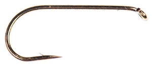 Traditional wide-gape style hook for dry flies and lighter nymph patterns. Bronze finish. Chemically sharpened. Small barb.